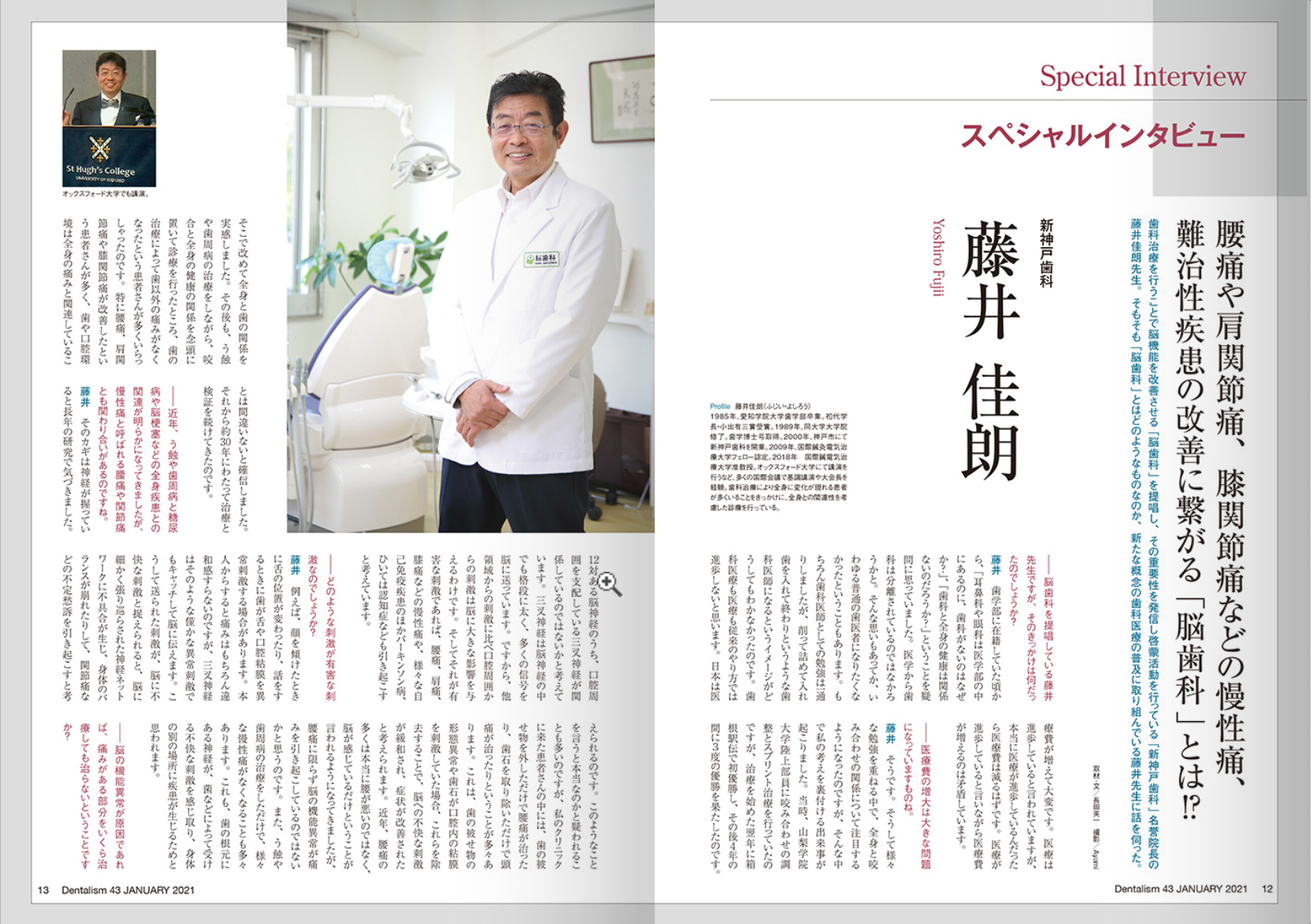腰痛や肩関節痛、膝関節痛などの慢性痛、難治性疾患の改善に繋がる「脳歯科」について4Pに渡りお話させていただきました。ご興味がある方は下記URLよりご閲覧ください。