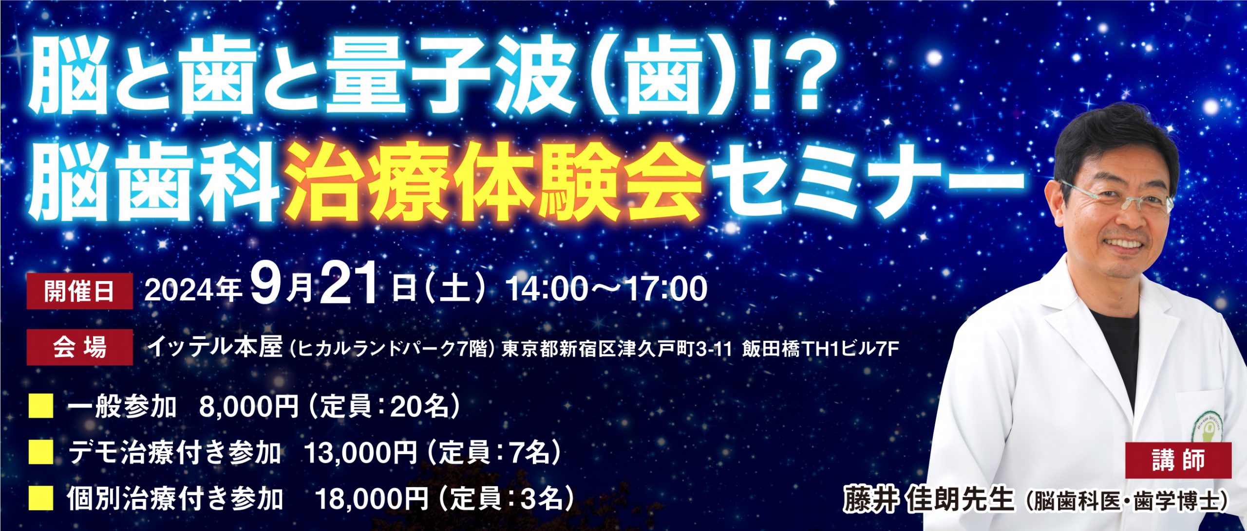 一般参加 8,000円/20人 デモ治療付き参加 13,000円/7人 個人治療付き参加 18,000円/3人 ZOOM参加 8,000円